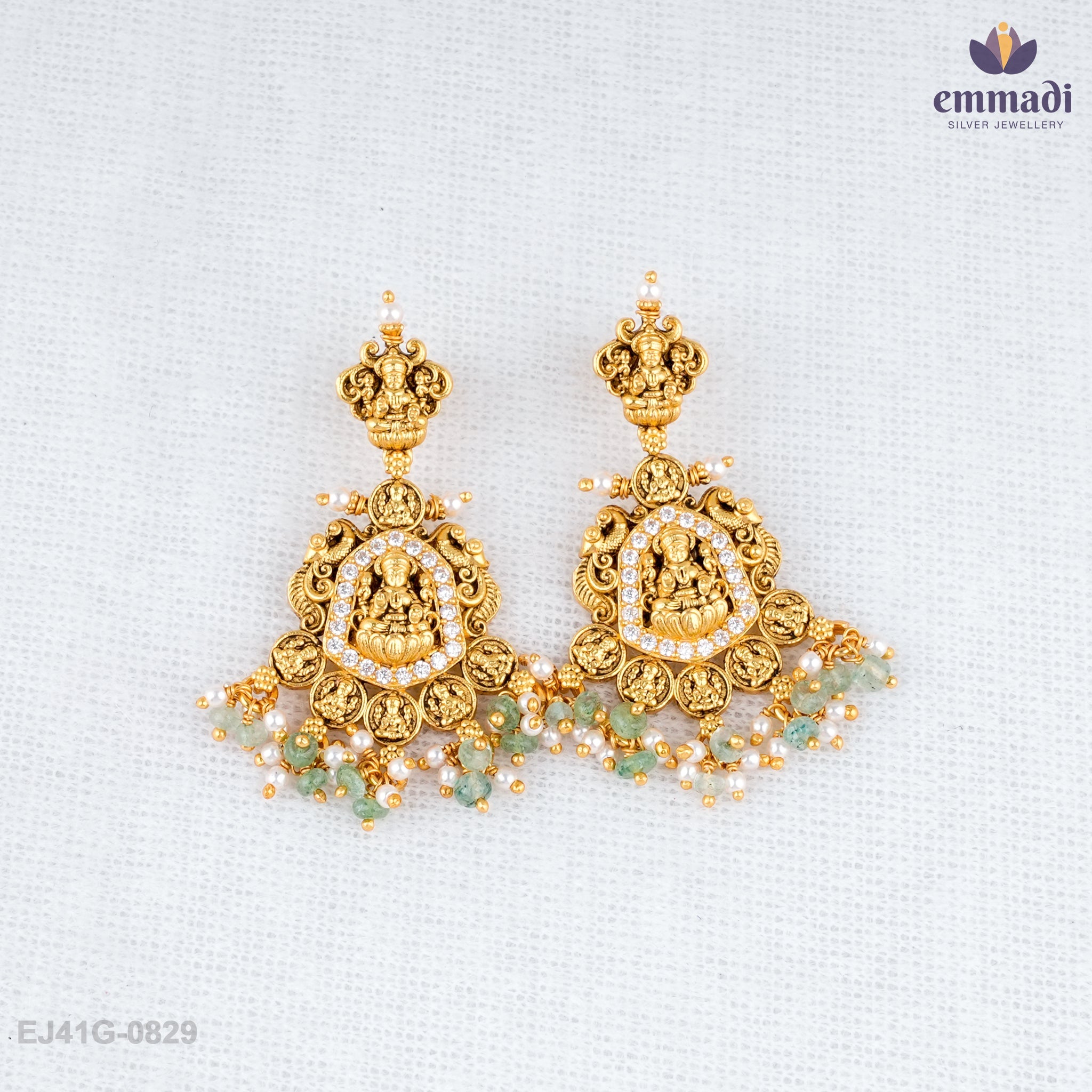 Handcrafted from pure 92.5 sterling silver, these stunning hangings feature intricate detailing that showcases the skill and artistry of master craftsmen. The sparkling white stones add a touch of brilliance, while the rich gold plating offers a regal finish, making these earrings an exquisite choice for weddings, festivals, or special occasions.