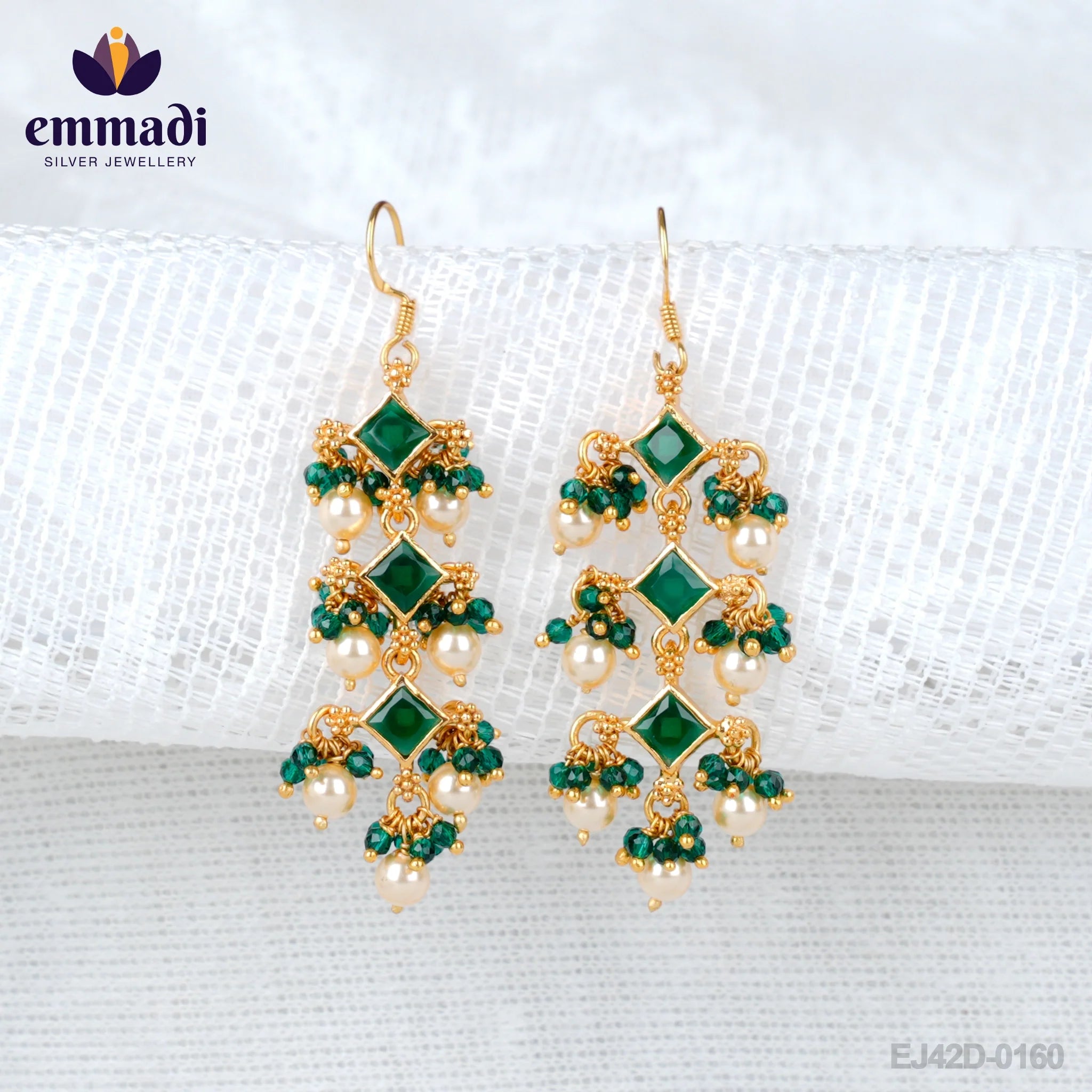 Manikya Hangings Stones Collection offers beautifully handcrafted earrings made with 92.5 silver and pure gold plating by Emmadi Jewellers. Each pair of earrings is adorned with stunning semi-precious stones that add a touch of elegance and glamour to any outfit.
