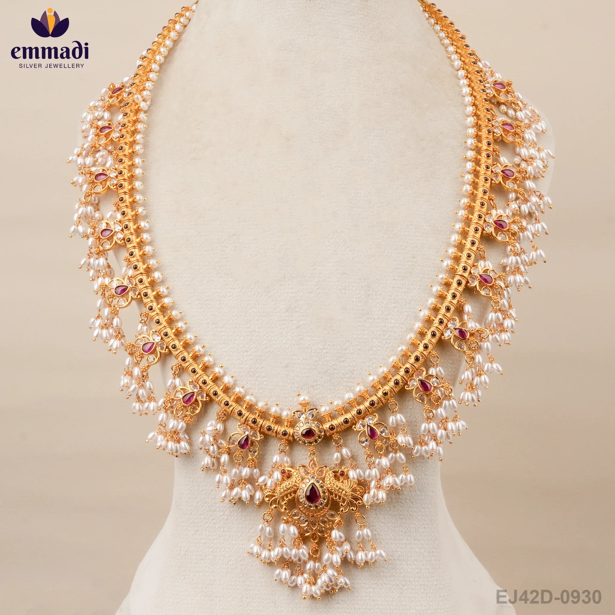 Indulge in the timeless elegance of the Mandalini Guttapusalu Red Long Necklace by Emmadi Silver Jeweller, India's Largest silver brand. Adorn yourself with this exquisite piece that exudes opulence and sophistication. The rich red hues of the necklace beautifully complement its intricate design, making it a must-have accessory for those who appreciate luxury and style. Elevate your look with this statement necklace and let your inner beauty shine through.