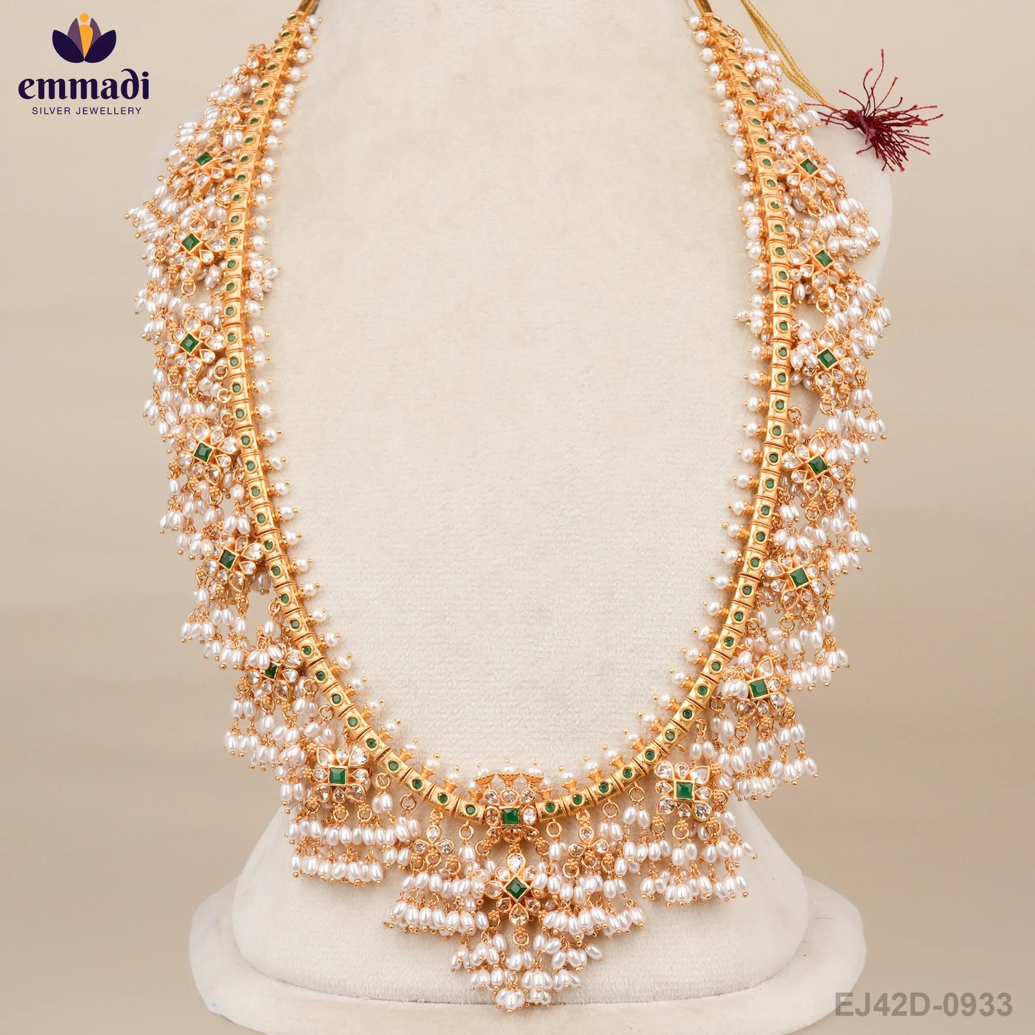 Indulge in opulence with the Mandodari Guttapusalu Green Long Necklace by Emmadi Silver Jeweller, India's Largest Silver Brand. This exquisite piece exudes elegance and sophistication, perfect for adding a touch of luxury to any outfit. The vivid green hue of the necklace is captivating, making it a statement accessory that will elevate your style effortlessly. Adorn yourself in glamour with this striking piece that is sure to turn heads wherever you go.
