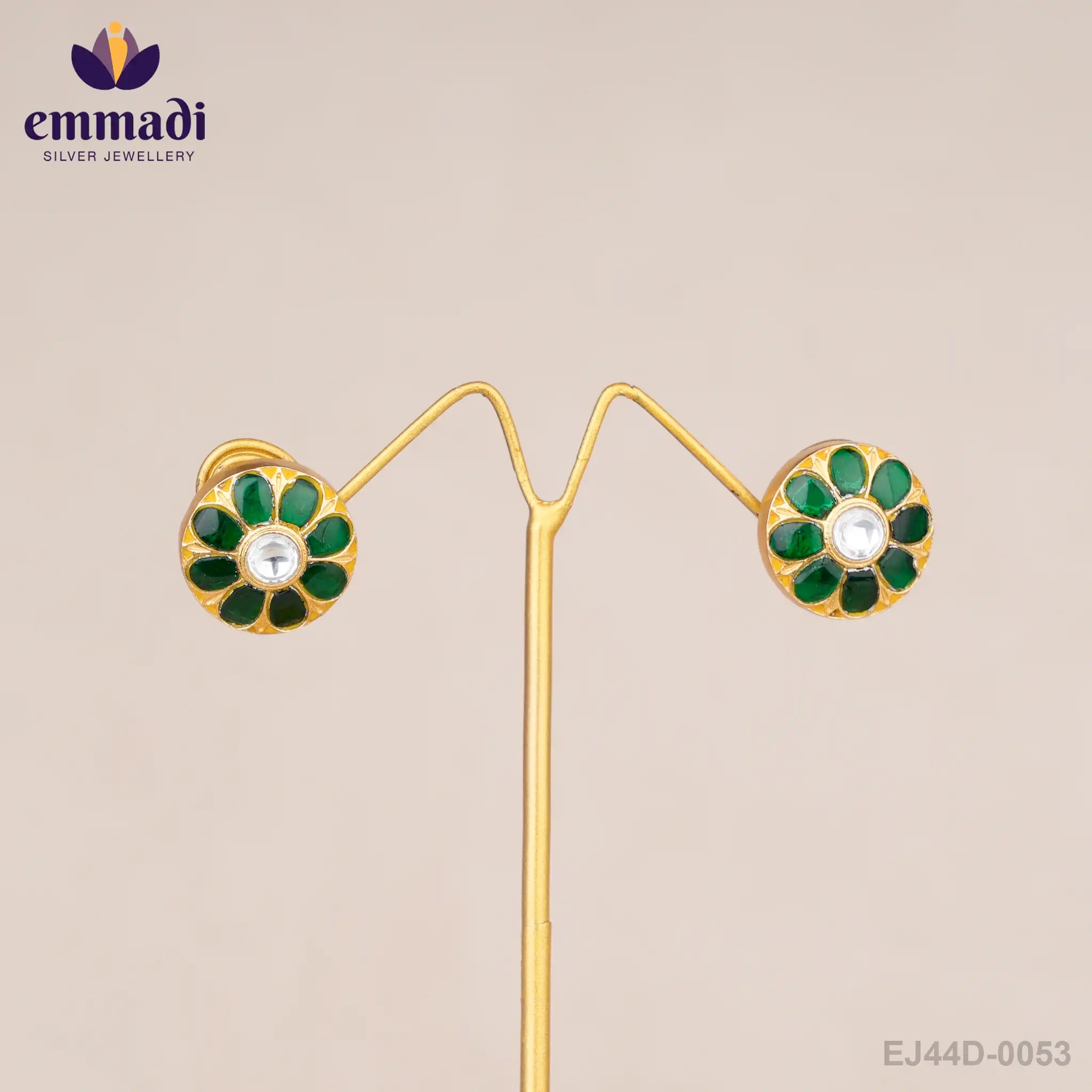 Indulge in the opulence of Manjushri Kundan Green Studs, crafted by the prestigious Emmadi Silver Jeweller ��� India's Largest silver brand. Elevate your style with these exquisite studs that exude sophistication and elegance. Let the radiant green hues of the kundan stones capture the light, adding a touch of glamour to your ensemble. Make a statement of pure luxury with these stunning earrings that are perfect for any special occasion.