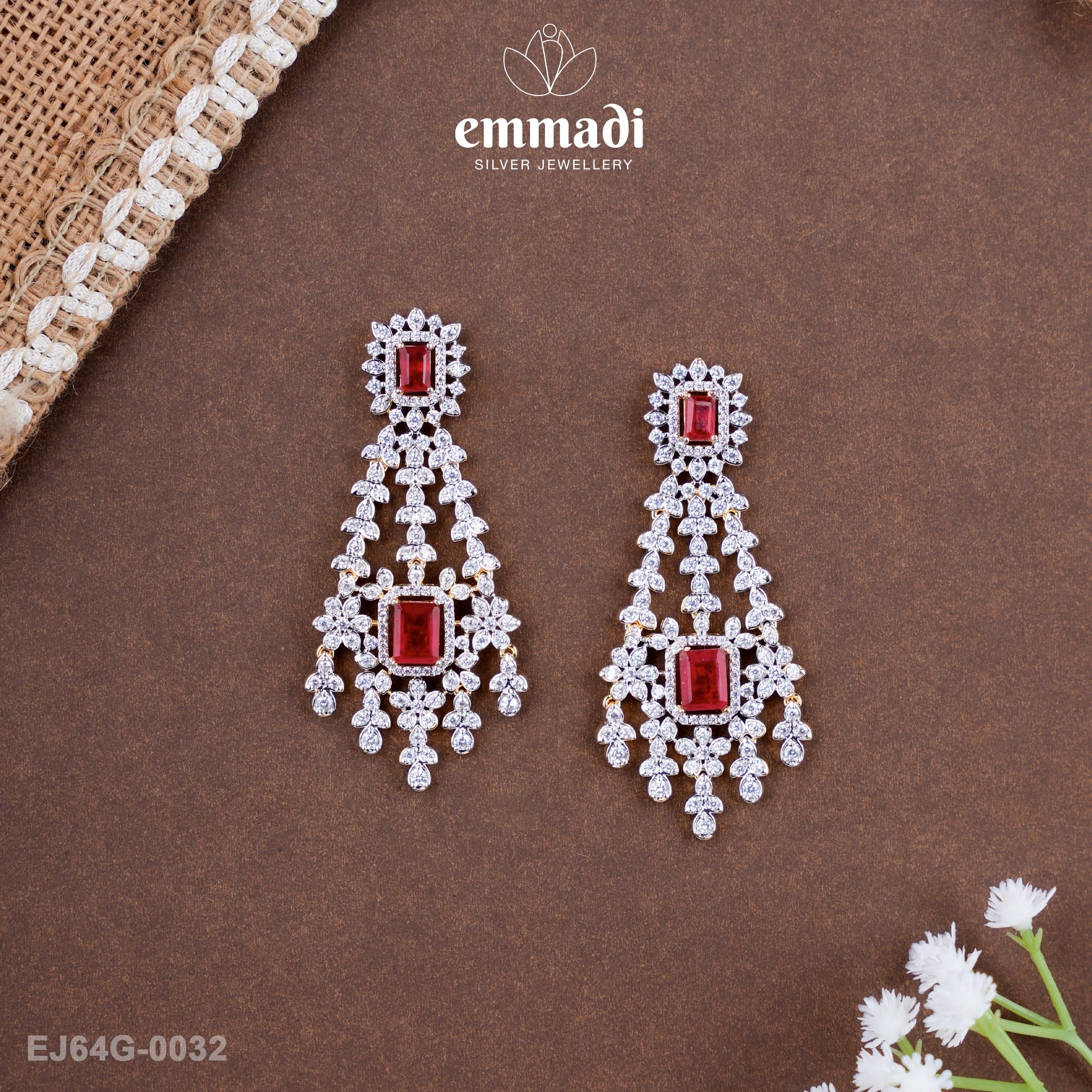 Indulge in the exquisite elegance of Mantravali Premium Cz Red Hangings, crafted by Emmadi Silver Jeweller, India's Largest silver brand. Elevate your style with these luxurious red hangings, exuding sophistication and glamour. Adorn yourself with the brilliance of premium CZ stones, reflecting opulence and refinement. Make a statement of impeccable taste with these stunning earrings.