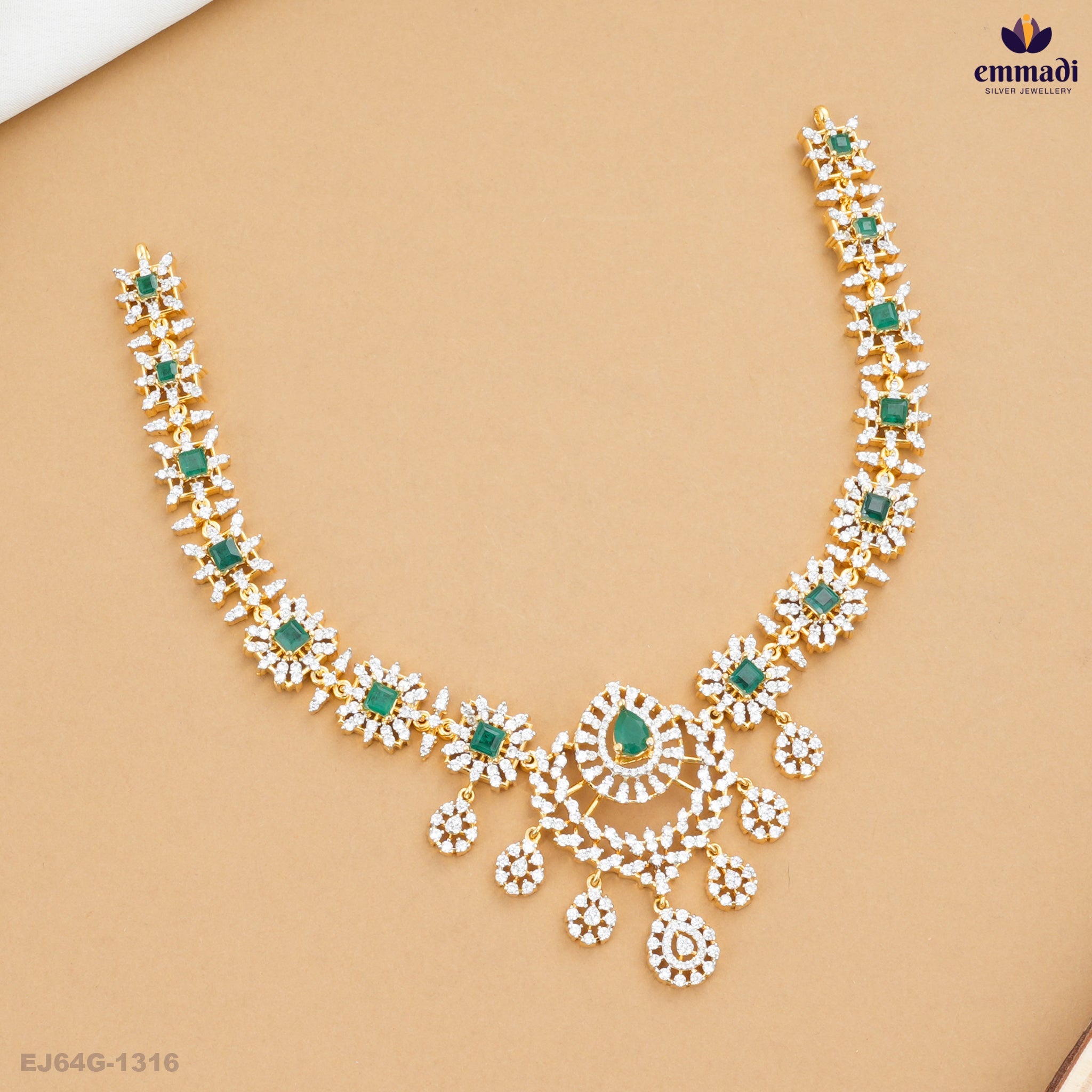 Discover the elegance of the Aranyaka Exquisite Green Premium CZ Necklace, a statement piece that effortlessly combines artistry and sophistication. Crafted with impeccable attention to detail, this necklace is designed for individuals who appreciate the allure of fine jewellery.