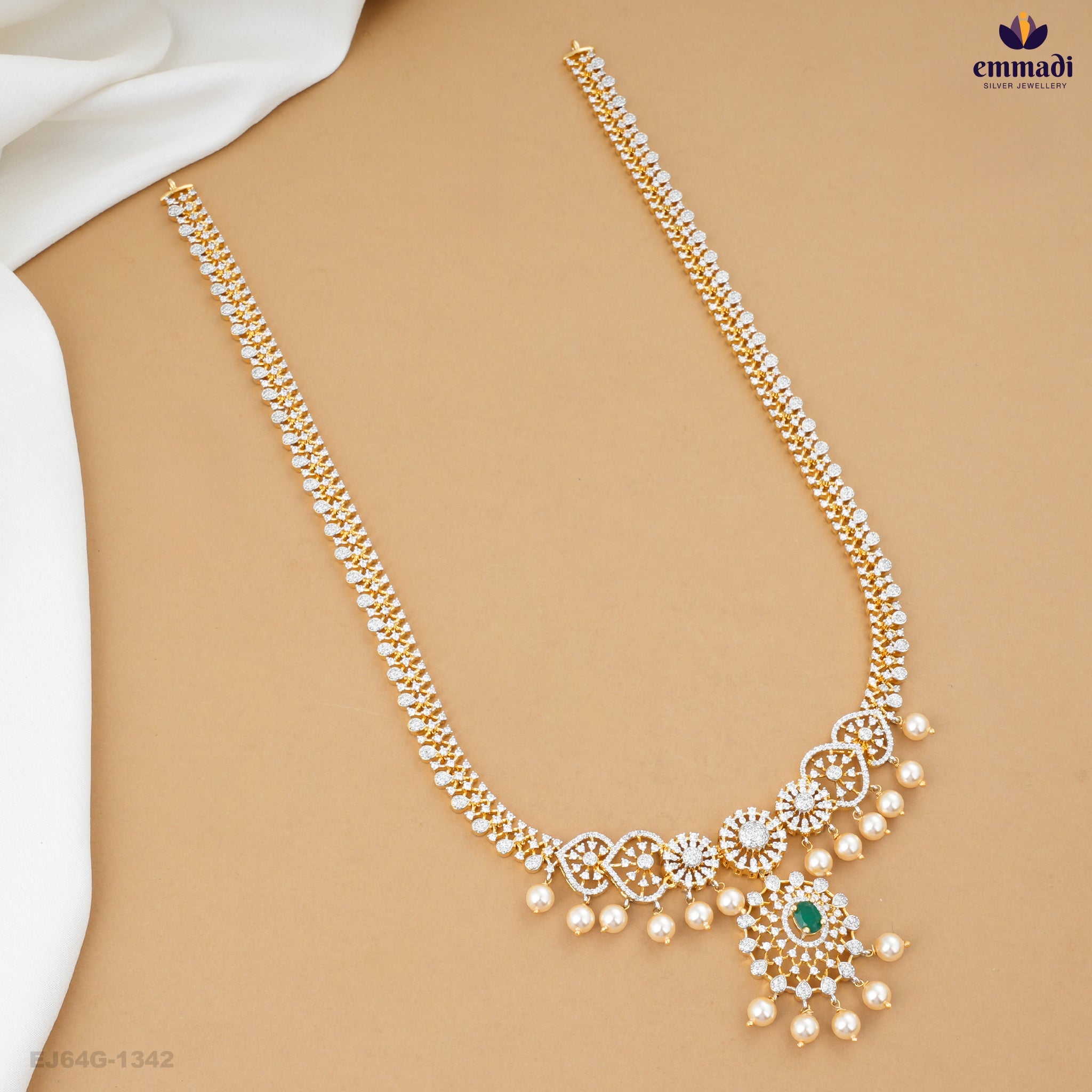 Discover the enchanting charm of the ARULCHELVI Elegant Green CZ Long Necklace, a stunning addition to your jewellery collection. This exquisite piece showcases a harmonious blend of premium-quality cubic zirconia, meticulously crafted to reflect light and enhance allure. The rich green hue of the sparkling stones is reminiscent of lush emeralds, adding a touch of sophistication and elegance to any outfit, from casual day wear to glamorous evening attire.