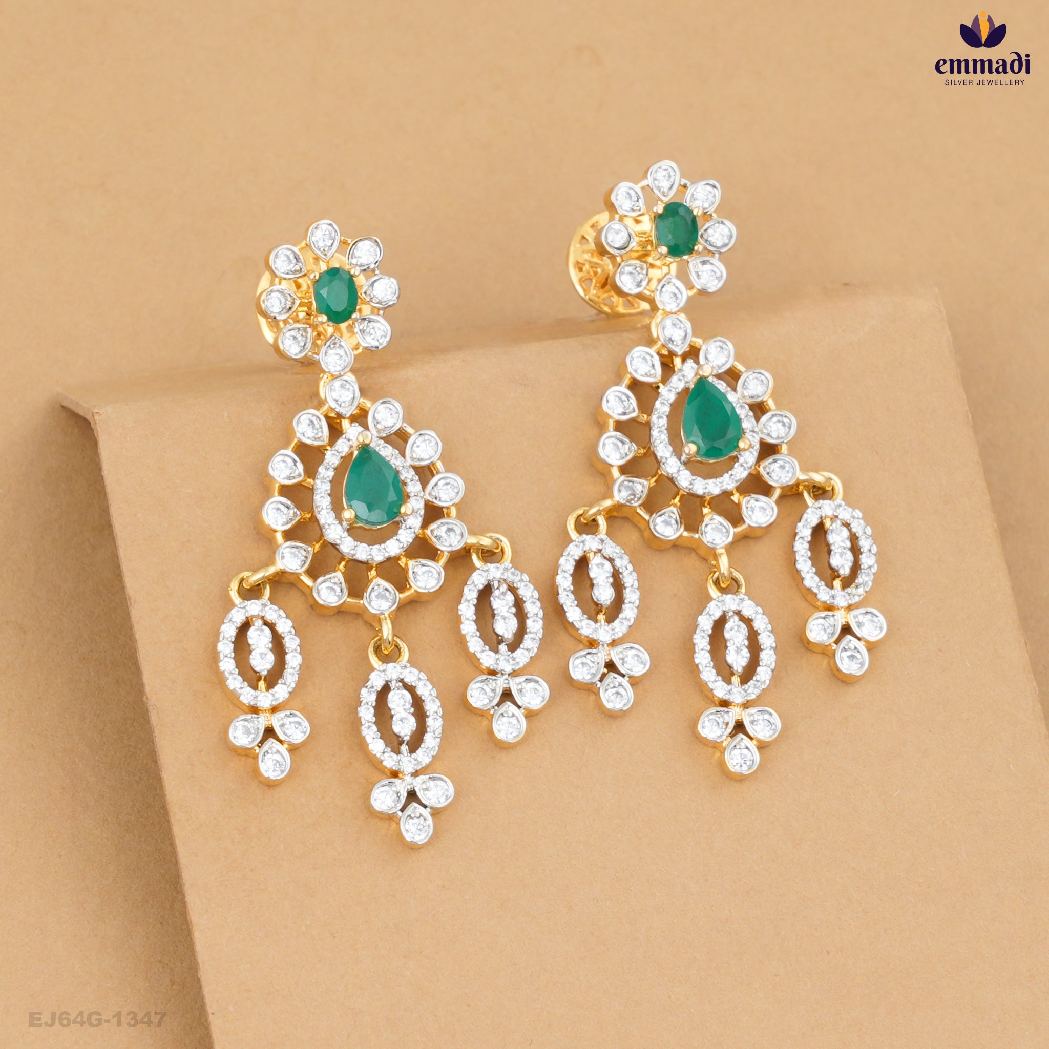 The vibrant green color of the CZ stones adds a touch of allure, making these hangings perfect for special occasions as well as everyday wear. The intricate design incorporates a harmonious blend of contemporary artistry and classic charm, making them ideal for both modern and traditional ensembles.