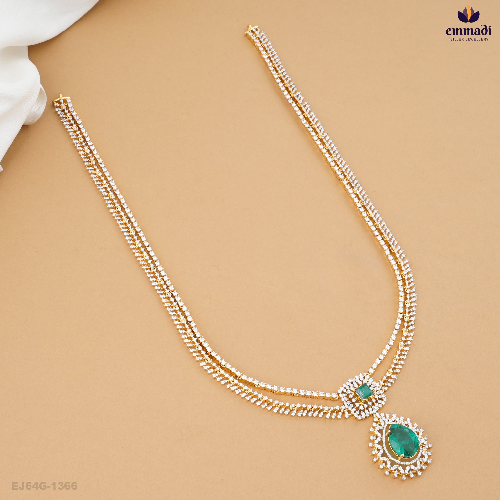 Discover the elegance of the ASHRITHA Silver Long Necklace featuring a stunningly intricate design that radiates luxury and sophistication. This exquisite piece showcases a cascade of premium cubic zirconia (CZ) stones, artfully arranged to capture and reflect light, creating a mesmerizing display that is sure to turn heads. The vibrant green color of the CZ stones adds a touch of nature-inspired beauty, making this necklace a perfect accessory for any occasion.