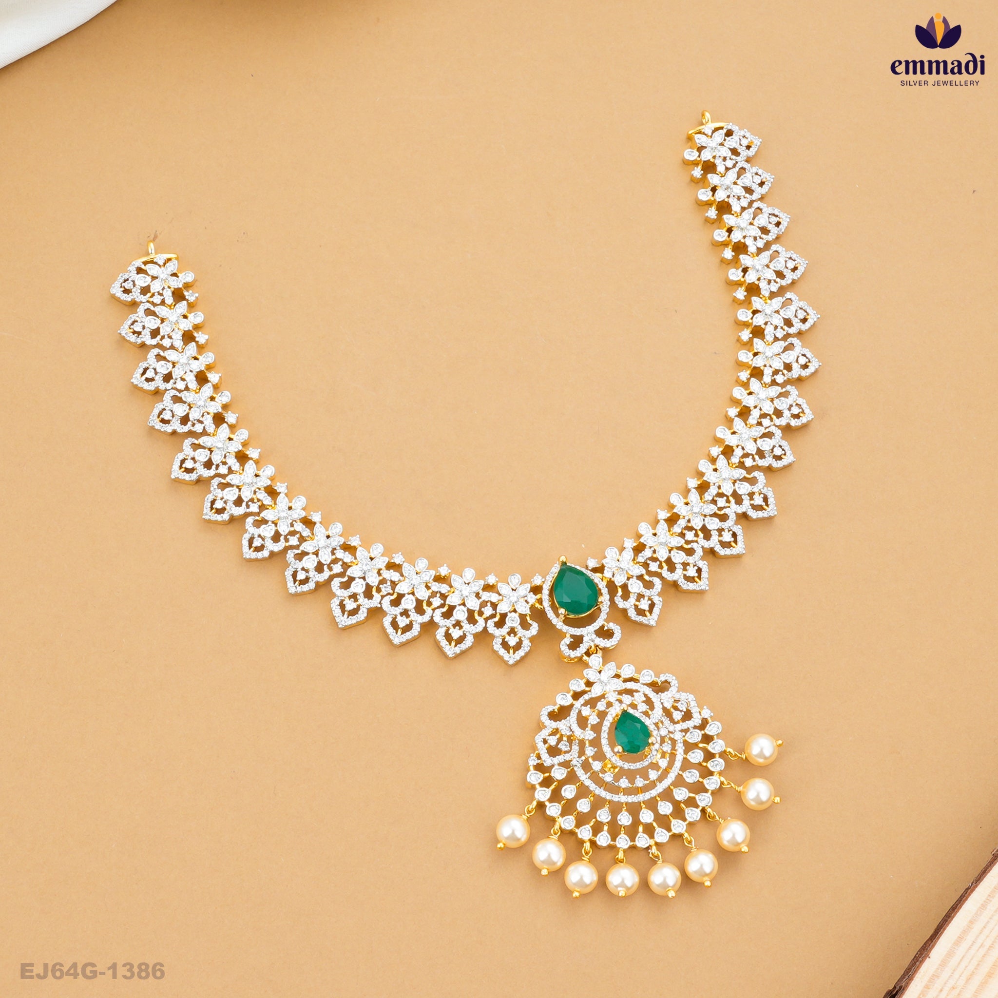 The necklace’s central pendant showcases a meticulously crafted green cubic zirconia that is elegantly surrounded by smaller, sparkling stones, creating an eye-catching focal point. This piece is set on a delicate yet durable chain, ensuring it lays gracefully against the neckline.