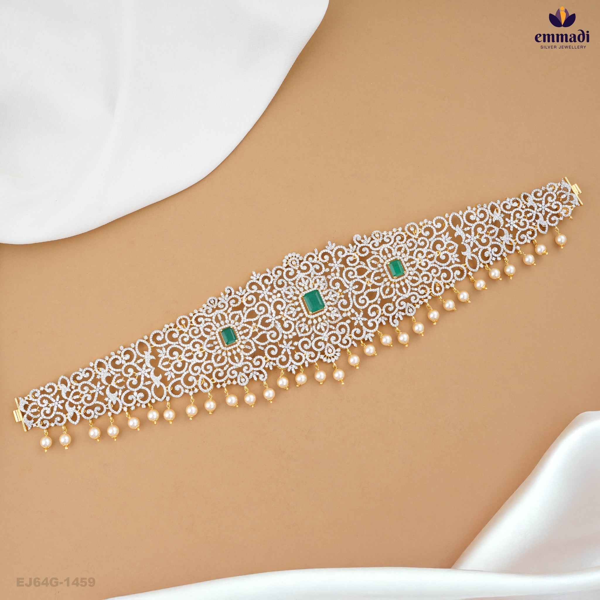 BASANTEE proudly presents an exquisite Vaddanam, an elegant piece of silver jewelry that embodies tradition and modern artistry. This premium Vaddanam features vibrant green CZ (cubic zirconia) stones that radiate brilliance and charm. The striking green hues not only enhance the visual appeal of the piece but also symbolize growth, harmony, and prosperity, making it a perfect accessory for any festive occasion or celebration.