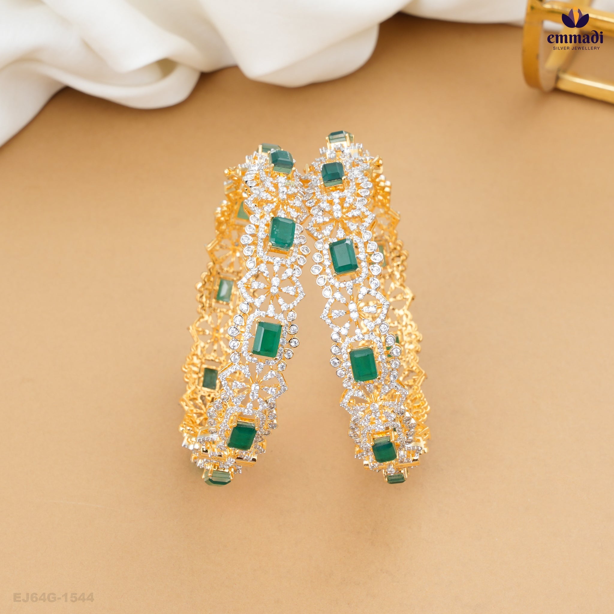 The vibrant green color of the cubic zirconia adds a touch of luxury, making these bangles an ideal accessory for any occasion, whether it be a festive celebration or a casual outing. The design features a seamless blend of traditional artistry and modern aesthetics, ensuring a versatile piece that complements both ethnic and contemporary attire.