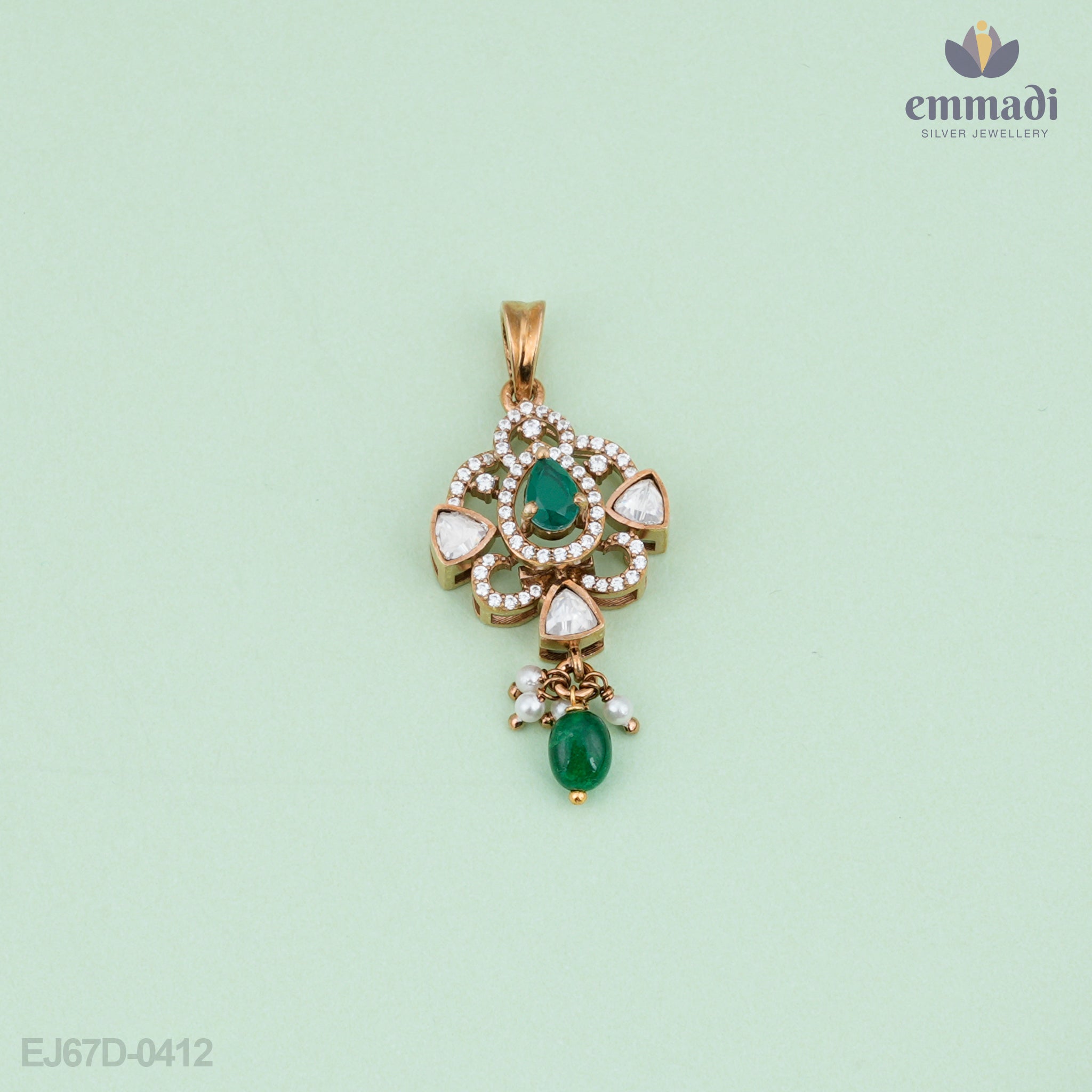 Crafted with meticulous attention to detail, this pendant features a captivating green gemstone at its center, radiating a rich and vibrant hue that symbolizes growth, harmony, and abundance. The gemstone is elegantly framed by an ornate, antique-style metal setting, which adds an extra layer of charm and uniqueness to the design. The intricate metalwork incorporates floral motifs and delicate filigree, reminiscent of the elegance seen in Victorian-era jewellery.