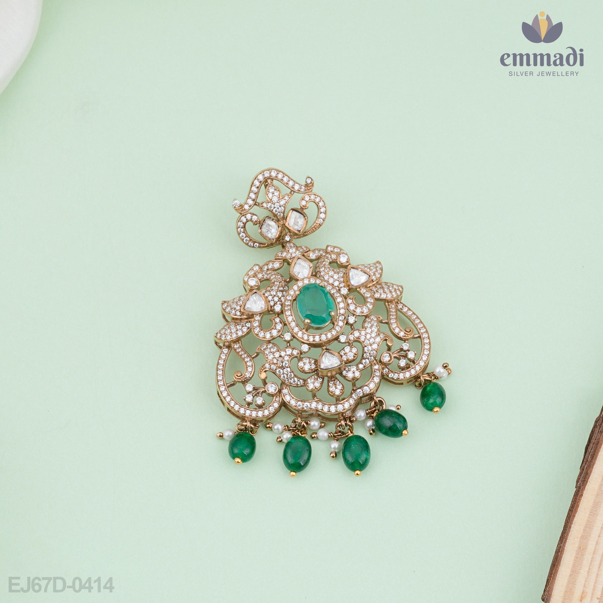 Introducing the Rukmini Exquisite Green Victorian Pendant, a stunning piece that embodies the elegance and charm of the Victorian era. This captivating pendant showcases a delicate and intricate design, making it a perfect statement piece for any occasion.
