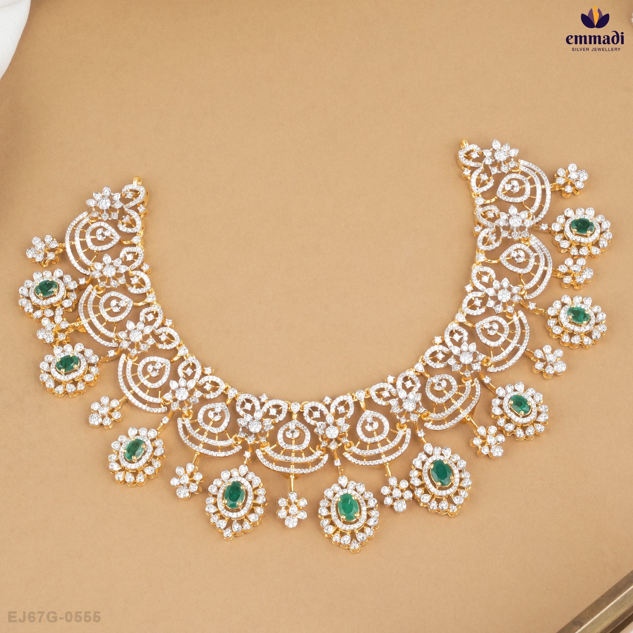 Introducing the AARATHANA Premium Green CZ Necklace, a stunning piece of silver jewellery that captures the essence of elegance and sophistication. Designed for the modern woman, this exquisite necklace features a captivating arrangement of high-quality cubic zirconia stones in a vibrant green hue. The brilliance of the CZ stones mimics that of precious gemstones, ensuring that you stand out on any occasion.