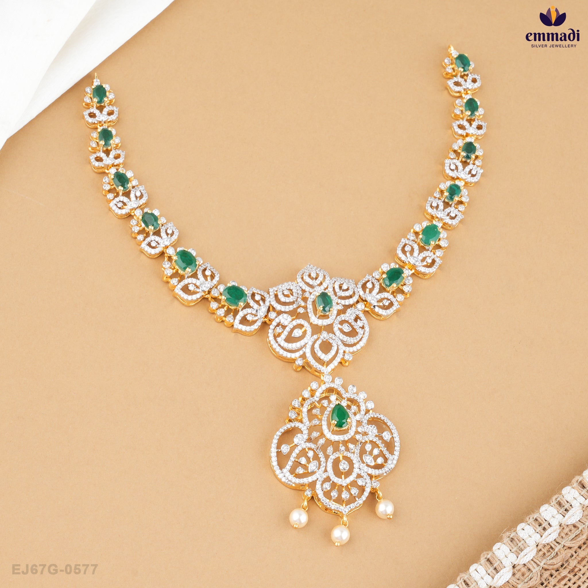 Introducing the ABHIDHA Elegant Green CZ Necklace, a stunning piece of jewelry that beautifully blends sophistication with a touch of modern glamour. This premium necklace features a stunning green cubic zirconia centerpiece, which exudes a captivating sparkle that is sure to draw attention. The exquisite design is crafted meticulously to create an eye-catching focal point, perfect for any occasion.