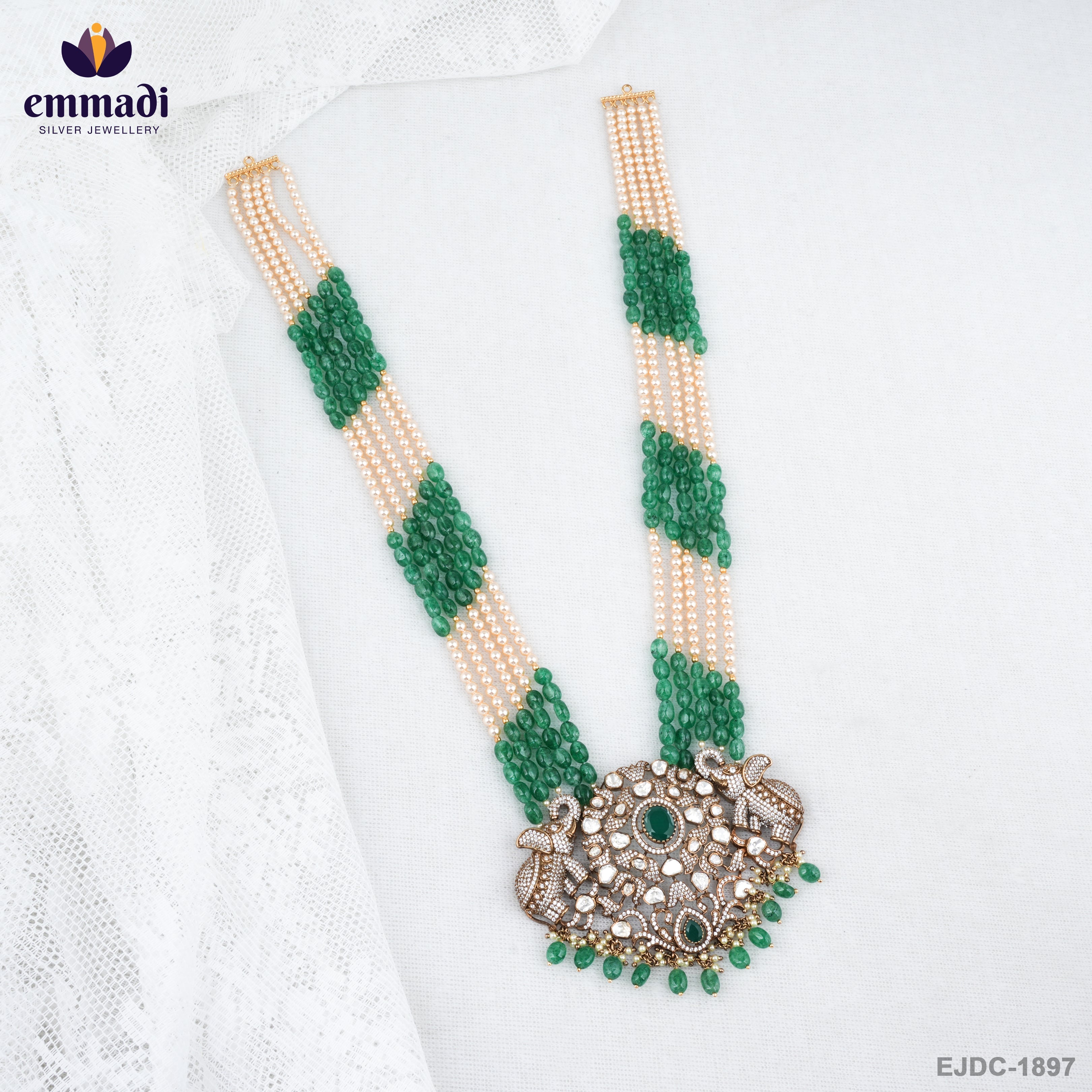 The necklace features carefully crafted links that cascade gracefully, adorned with delicately designed motifs inspired by classic Victorian aesthetics. The centerpiece boasts a stunning green gemstone that catches the light beautifully, adding a touch of elegance and sophistication. This gemstone is thoughtfully selected for its rich hue and intricate facets, ensuring that it stands out as a hallmark of luxury.