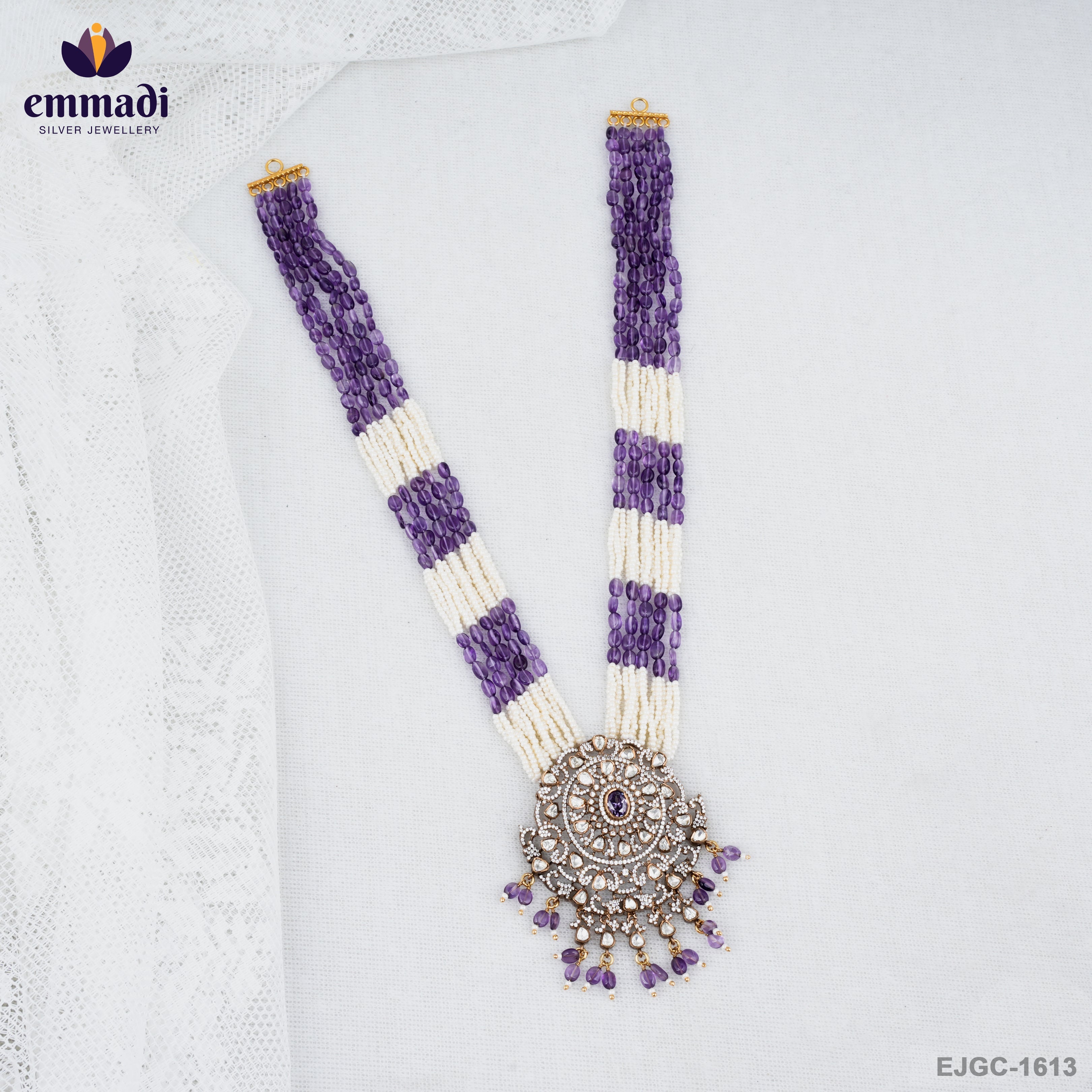 The necklace is designed with a series of beautifully crafted elements, seamlessly intertwined to form a captivating pattern. High-quality materials ensure durability while retaining a graceful shine that catches the light from every angle. At its center, a striking pendant is adorned with stunning purple hues, making it a perfect focal point for both casual and formal occasions.