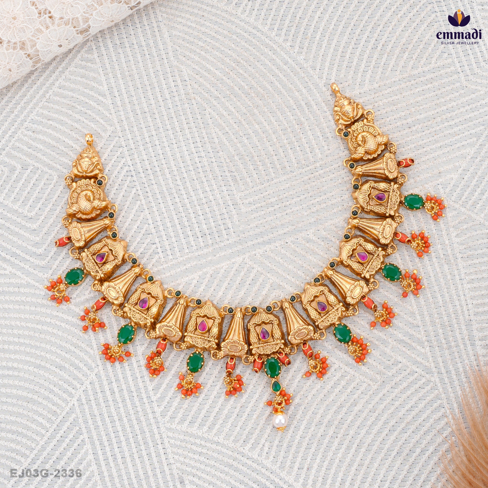 Introducing an exquisite collection that beautifully merges traditional artistry with contemporary elegance. This stunning jewellery line features intricate nakshi craftsmanship, showcasing a vibrant array of multi-colored corals and captivating green hues that embody the essence of nature's palette. Every piece reflects the skill and dedication of our artisans, making each item a true work of art.