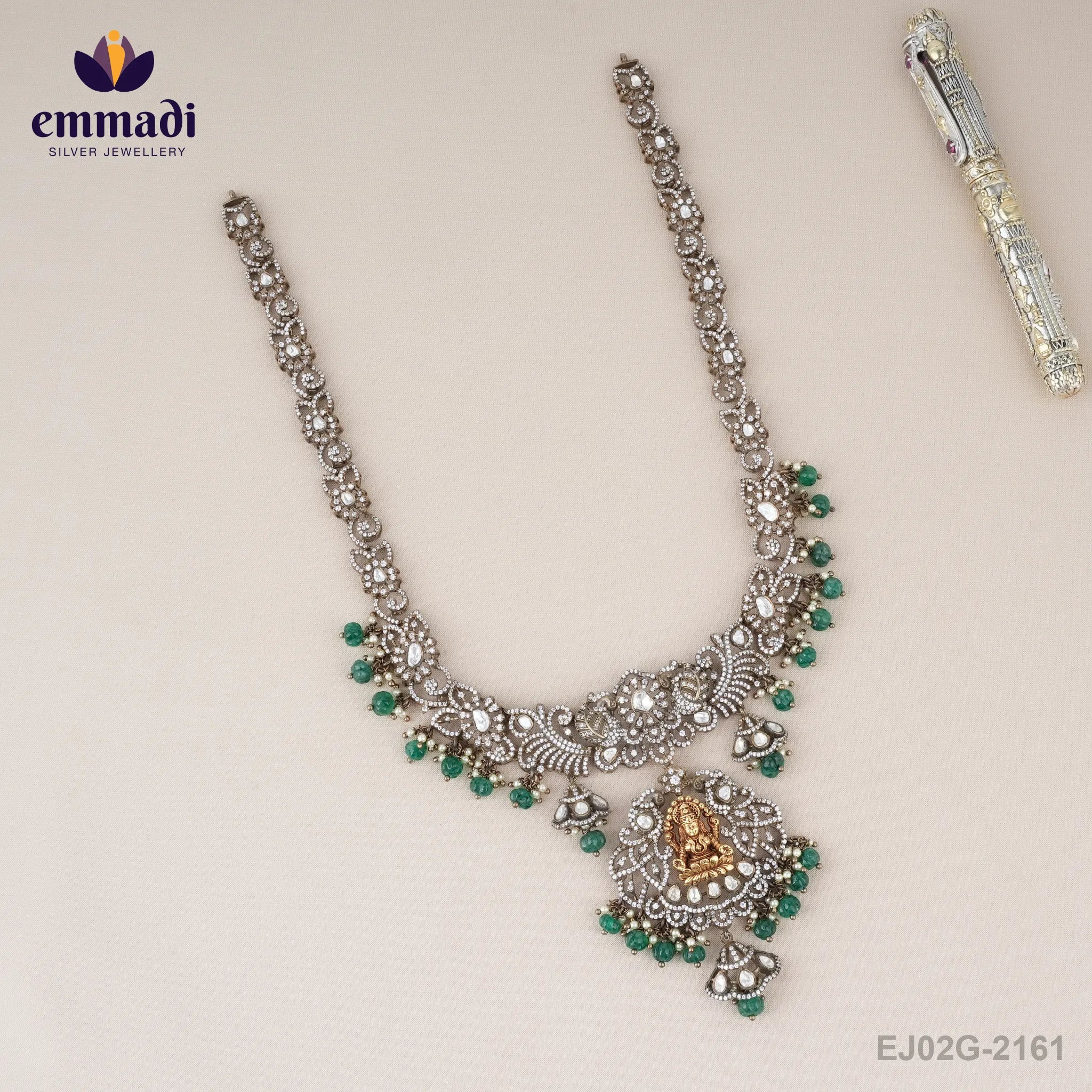 Indulge in the exquisite elegance of the Karuka Victorian Green Long Necklace by Emmadi Silver Jeweller, India's Largest silver brand. Elevate your style with this opulent piece that exudes sophistication and charm. The luxurious green hue of the necklace will effortlessly add a touch of glamour to any outfit, making it a must-have accessory for those who appreciate the finer things in life. Adorn yourself with the timeless beauty of the Karuka Victorian Green Long Necklace and step into a world of refined luxury.