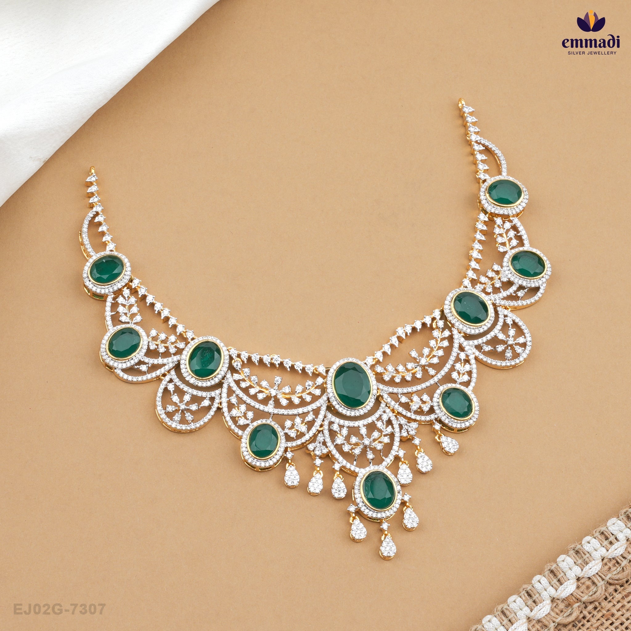 The necklace features a delicate chain that ensures comfort while enhancing your look with an air of elegance. Its intricate design brilliantly highlights the sparkling cubic zirconia, creating a striking contrast against the lush green gemstones. Each stone is precisely cut to reflect light beautifully, making this piece truly eye-catching and versatile enough to pair with a variety of outfits.