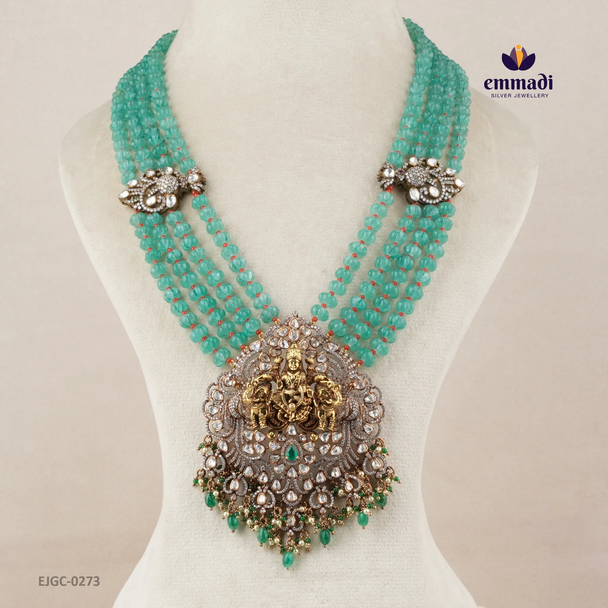 The long necklace showcases the enchanting green hues of Victorian splendour, beautifully blending tradition with contemporary style. Its intricate design not only enhances your look but also reflects your unique sense of fashion. Whether you're dressing up for a special occasion or adding a chic touch to your everyday attire, this piece is sure to make a statement and leave a lasting impression.