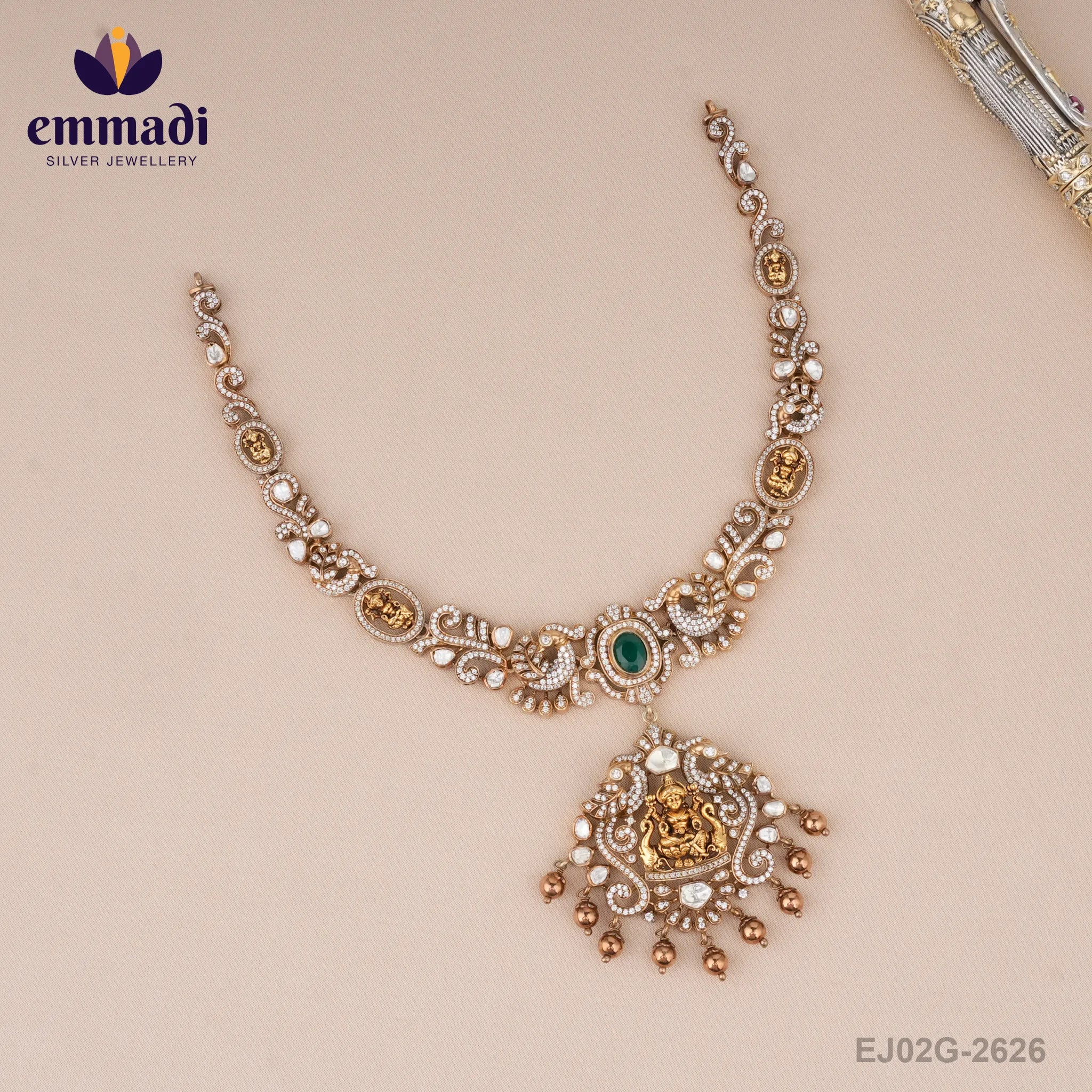 Indulge in the opulence of the Nilaya Victorian Green Necklace by Emmadi Silver Jeweller, adorned with sophistication and splendour. Transform any ensemble into a statement of elegance with this exquisite creation, crafted to perfection. Elevate your style to new heights with the unparalleled beauty of this striking piece. Experience the allure of luxury with Emmadi Silver Jeweller, India's Largest silver brand.
