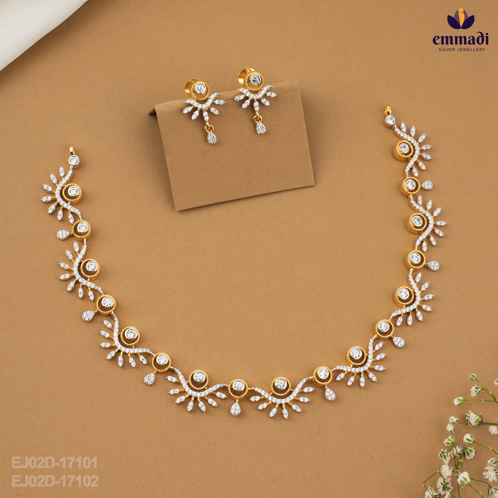 Introducing a stunning collection that redefines elegance and sophistication, featuring exquisite handcrafted jewelry designed by the renowned artisan Emmadi. This remarkable selection includes a dazzling necklace and a pair of striking hangings, both meticulously crafted from high-quality 92.5% silver and lavishly plated in pure gold, ensuring a luxurious finish that catches the eye.