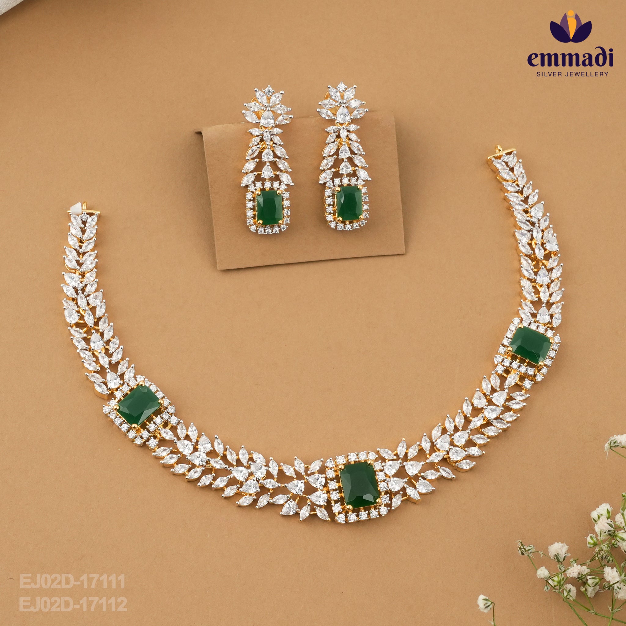 Introducing an exquisite collection of handcrafted jewelry that embodies elegance and sophistication, designed by the talented Emmadi. This stunning set features a breathtaking necklace and captivating hangings, both meticulously crafted with pure 92.5 silver and adorned with luxurious gold plating. Each piece radiates artistry and luxury, showcasing vibrant green cubic zirconia stones that capture the essence of nature’s beauty.