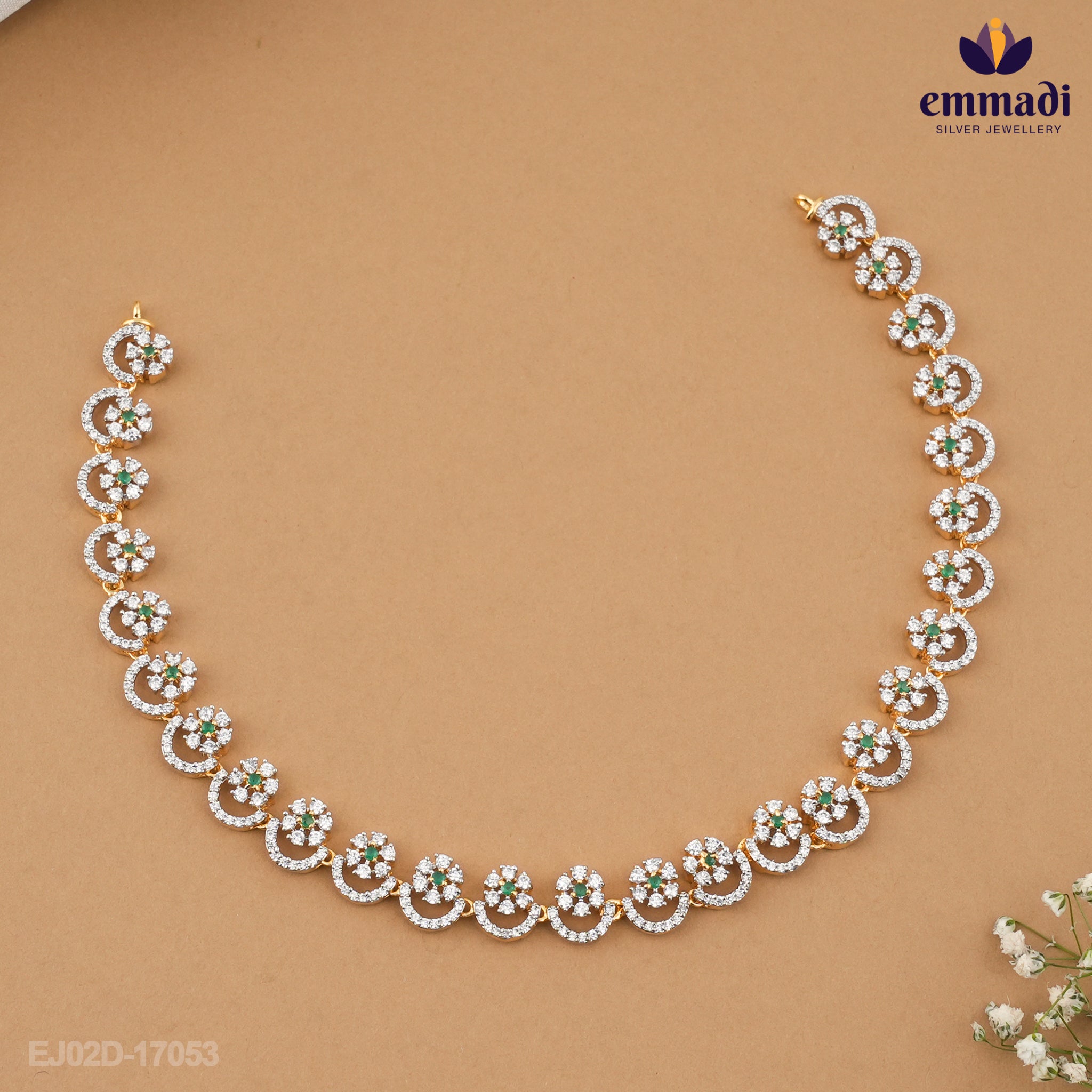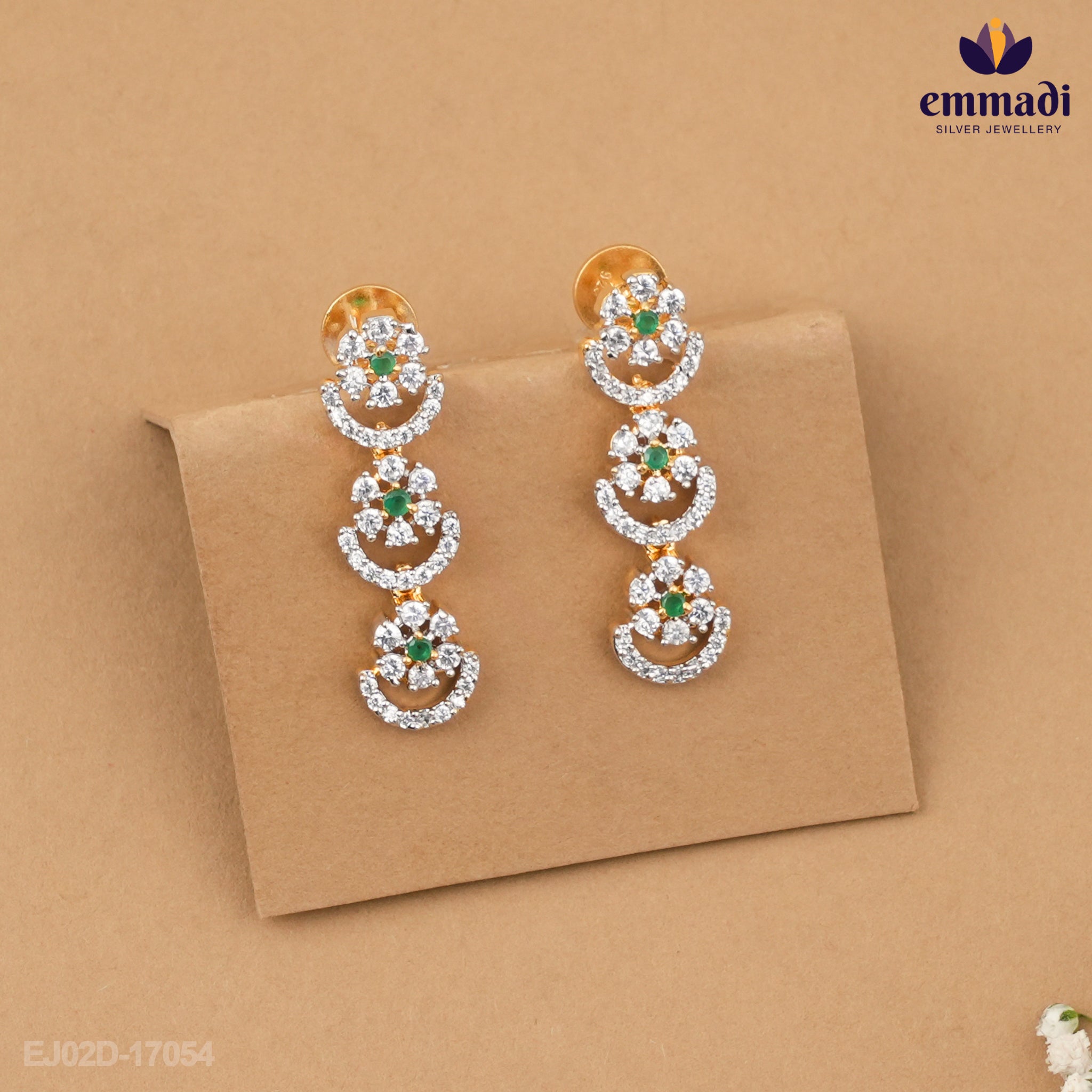 Complementing the necklace, the hanging earrings are also meticulously crafted from pure 92.5 silver and adorned with premium cubic zirconia. These earrings shimmer with every movement, drawing compliments and admiration wherever you go. The captivating green stones add a touch of elegance and sophistication, making them perfect for evening events or a night out on the town. A luxurious layer of pure gold plating enhances their allure, offering a beautiful contrast to the silver and green hues.