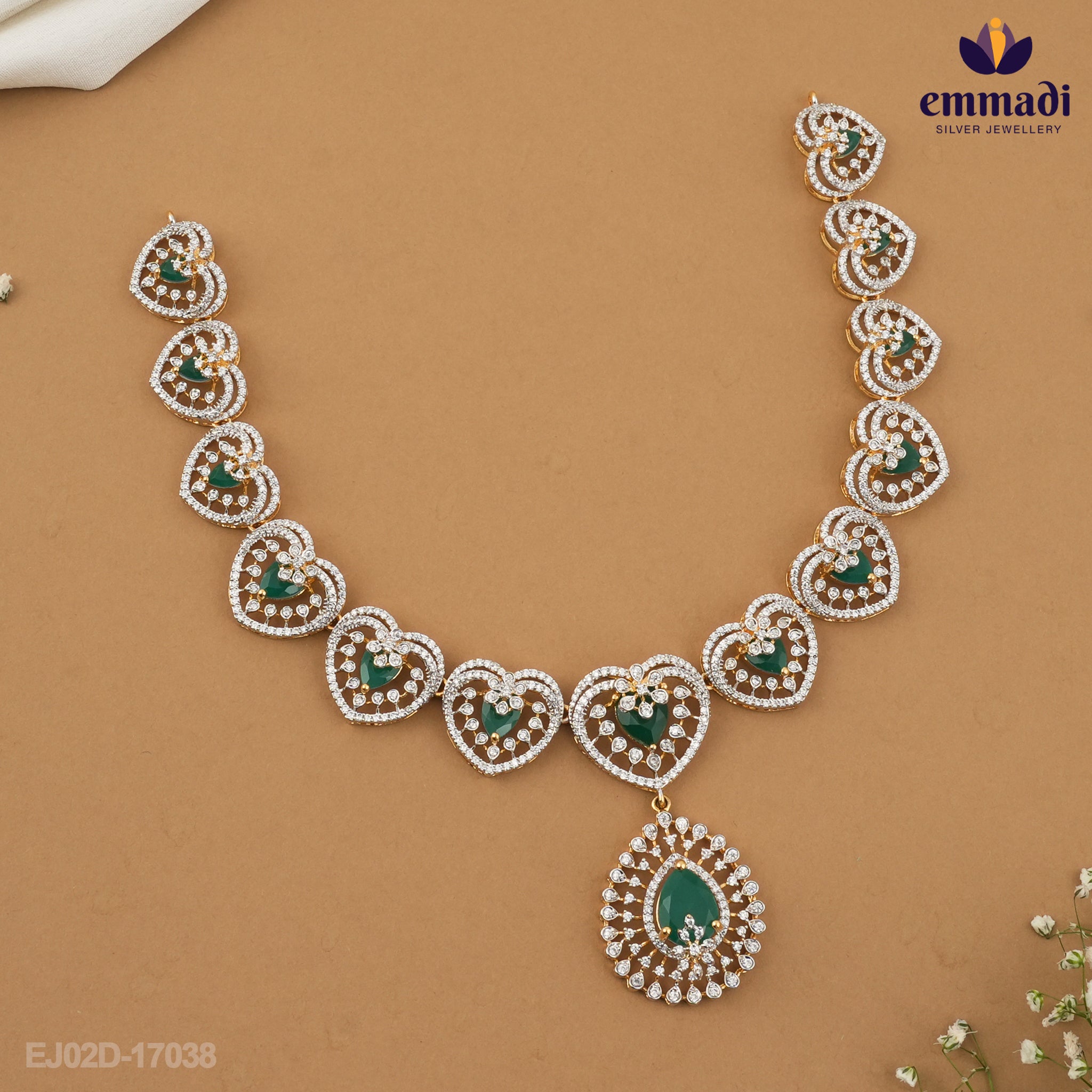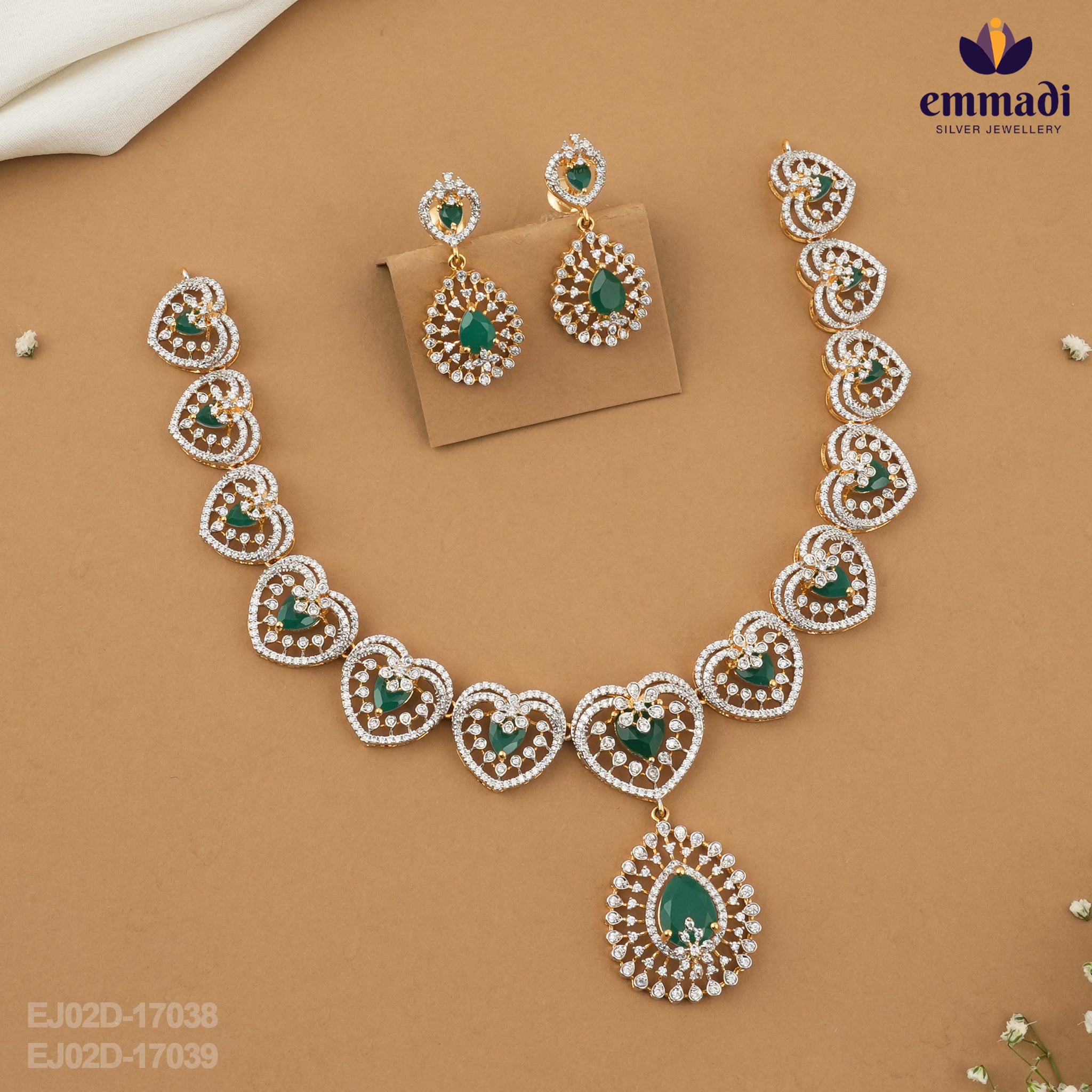 Elevate your jewelry collection with a stunning ensemble that combines exquisite craftsmanship and timeless elegance. Designed by the renowned artist Emmadi, this handcrafted jewelry set features a captivating necklace and a pair of luxurious earrings, both adorned with premium cubic zirconia stones in a striking green hue.