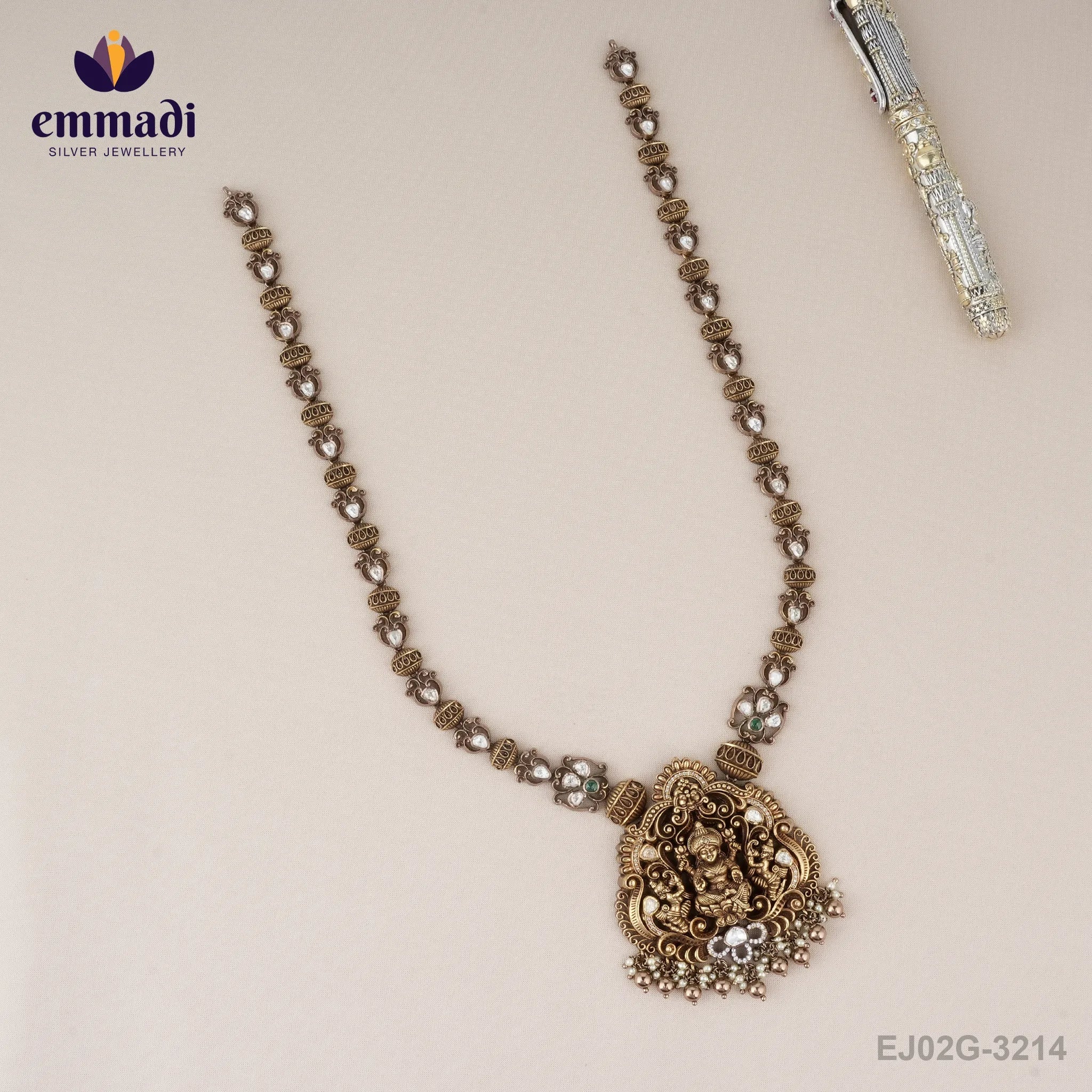 Indulge in the opulence of the Sara?a Victorian Green Long Necklace by Emmadi Silver Jeweller, India's Largest silver brand. Adorn yourself with this exquisite piece, dripping with Victorian charm and adorned in a captivating shade of green. Elevate your ensemble with a touch of luxury that whispers of elegance and sophistication. Make a statement at any occasion and exude a timeless beauty that is truly unmatched.
