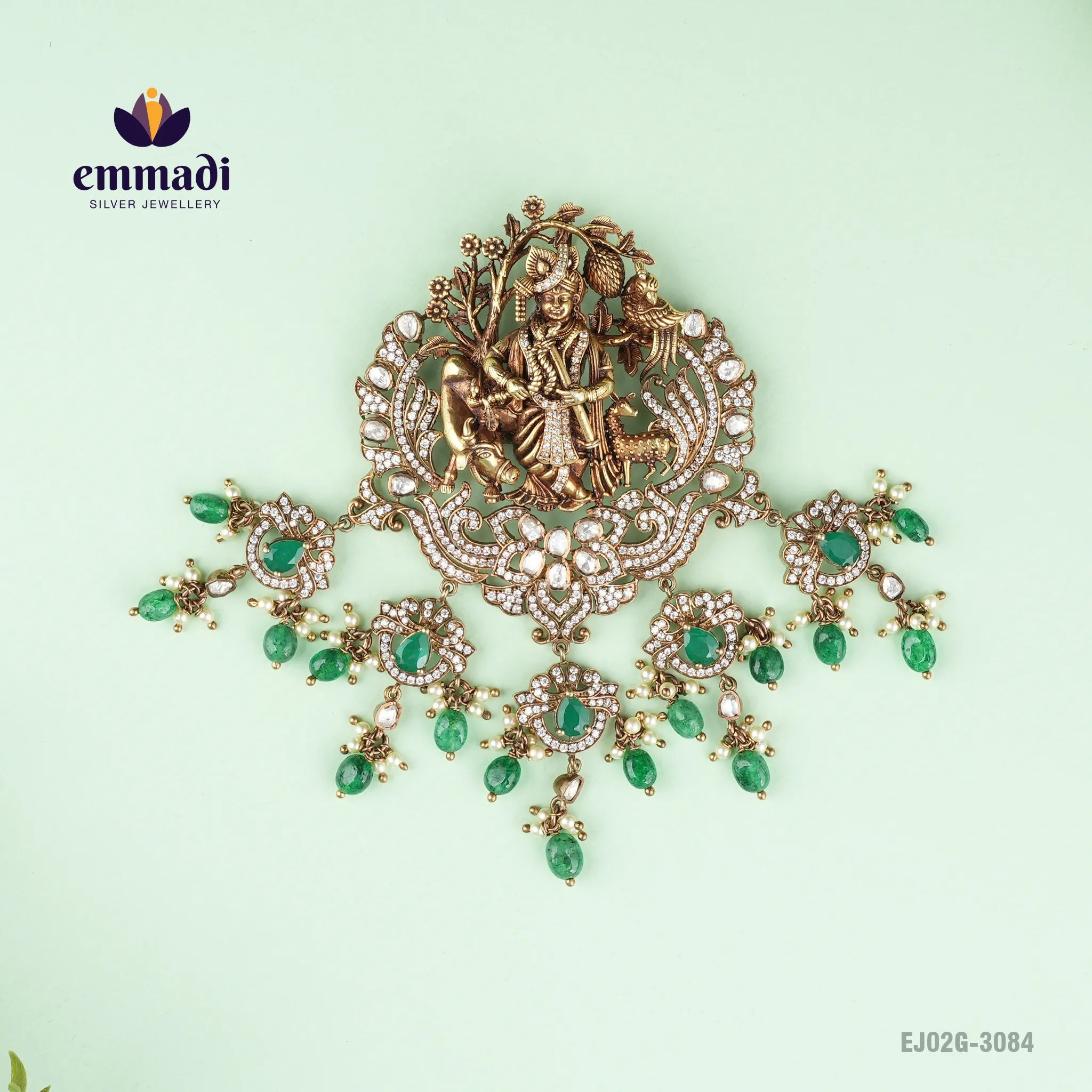 Indulge in the opulence of Victorian-inspired jewellery with this stunning collection from Emmadi Silver Jeweller, India's Largest silver brand. Each piece is a radiant masterpiece, meticulously handcrafted to perfection, showcasing exquisite craftsmanship and intricate detailing. The captivating green stones featured in both the pendant and earrings transport you to a realm of sophistication and elegance.