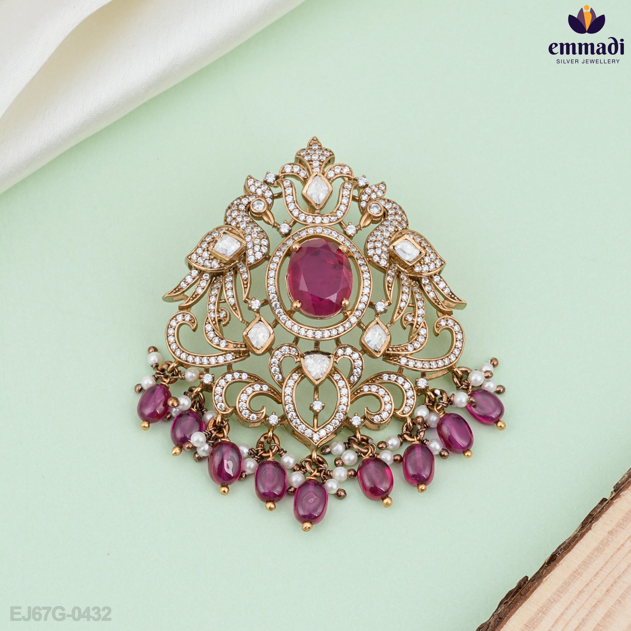 Complementing the pendant are exquisite earrings that feature intricate filigree work and ornate detailing. Each earring is adorned with luxurious gemstones, providing a striking pop of color that beautifully contrasts against rich, vintage-inspired metalwork. Measuring approximately 3 inches in length, these earrings gracefully sway and catch the light with every movement, making them a standout addition to any outfit.